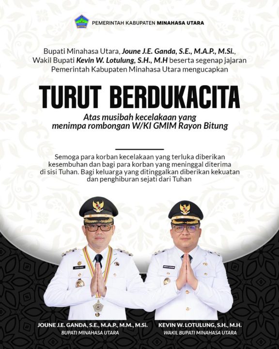 “Atas nama Pemerintah Kabupaten Minahasa Utara, Pribadi dan keluarga menyampaikan Turut Berdukacita atas musibah yang menimpa Rombongan WKI GMIM Kanaan Winenet Wilayah Bitung 12. Tuhan Yesus Kristus Sumber Penghiburan Bagi Keluarga Yang Ditinggalkan,” ujar Bupati Joune diamini Wabup Kevin.