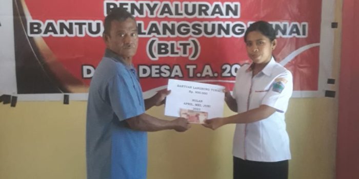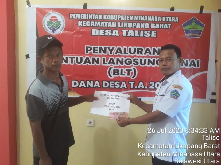 Penyaluran BLT-DD yang digelar di kantor Desa, Rabu (26/07/2023), di pimpin langsung oleh pjb Hukum Tua Desa Talise Roni Ferdy Kirauhe.
