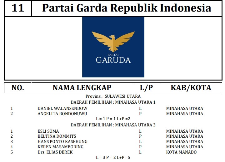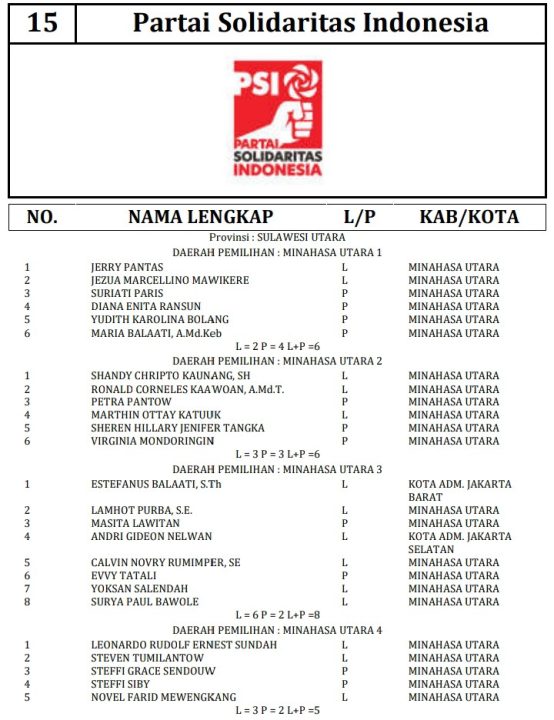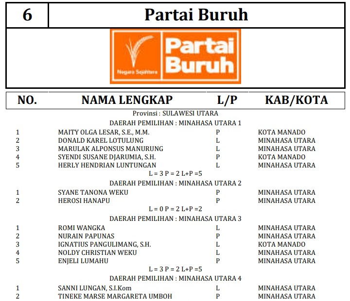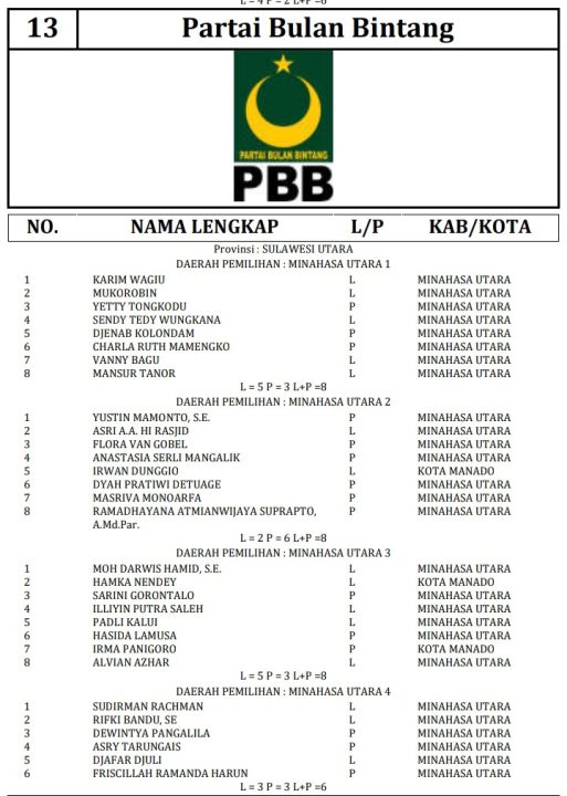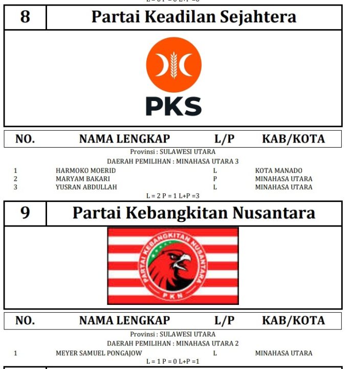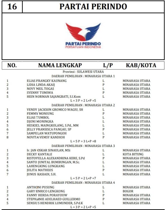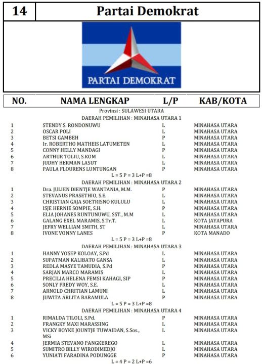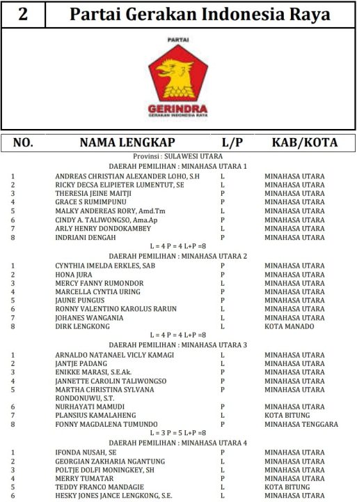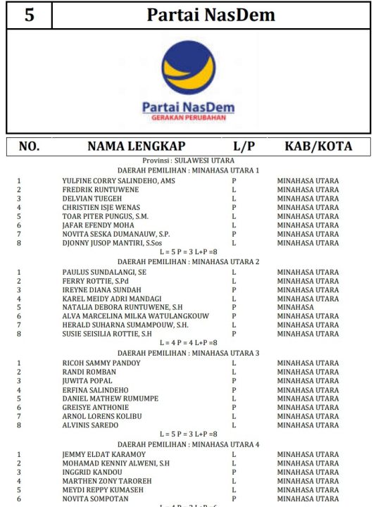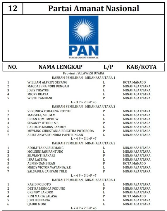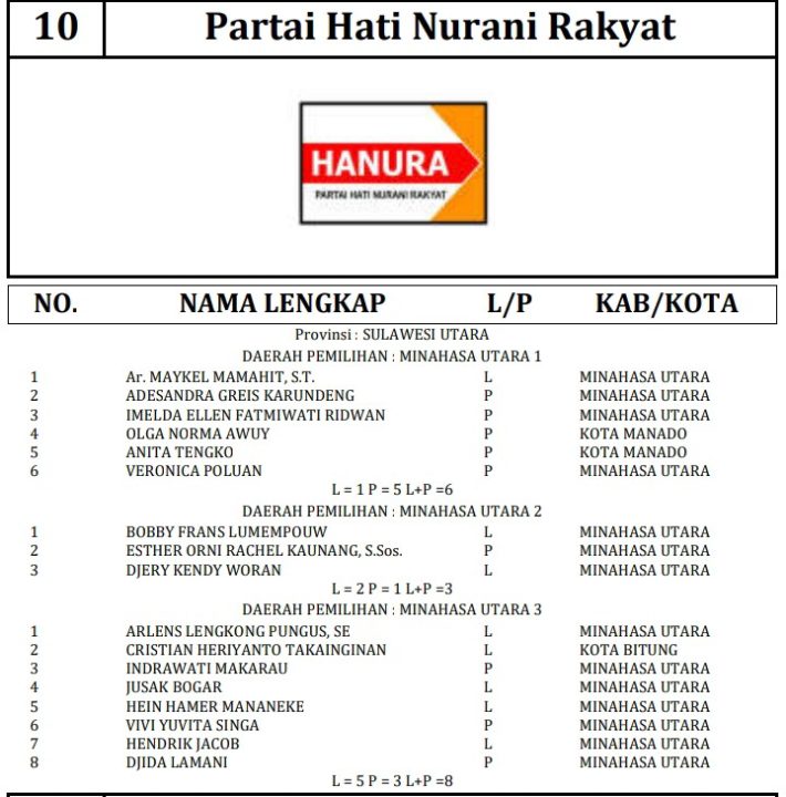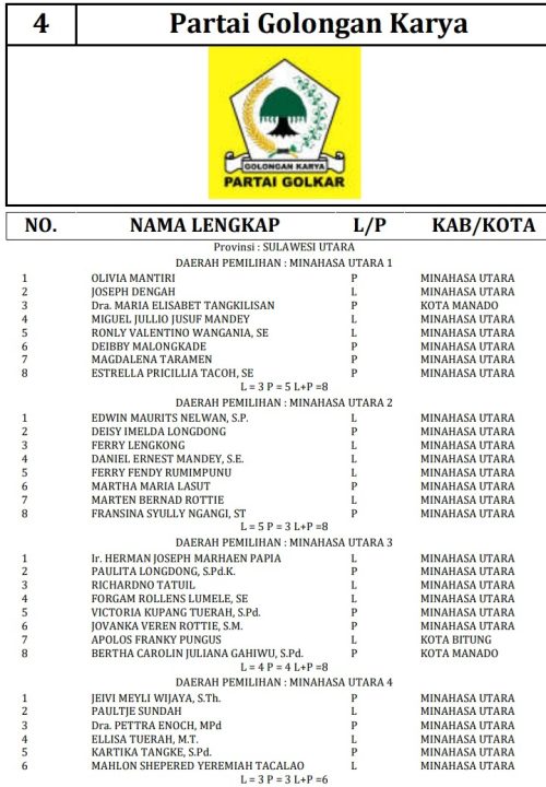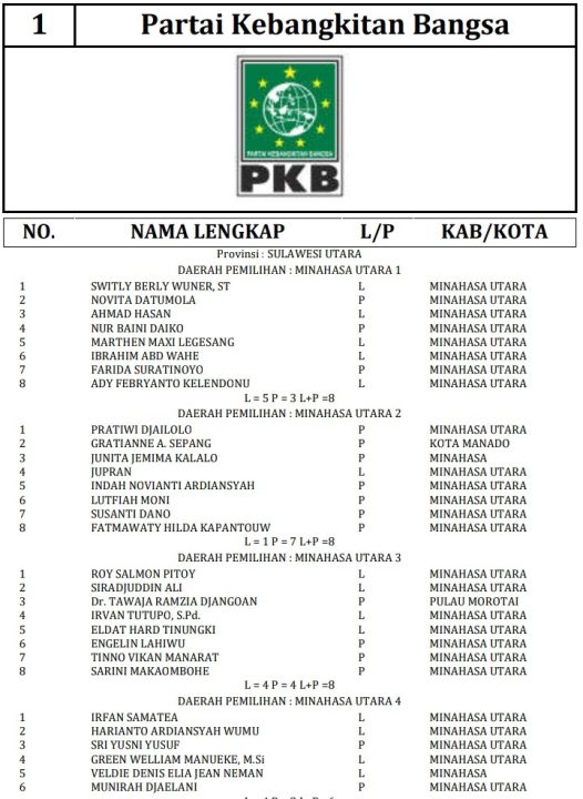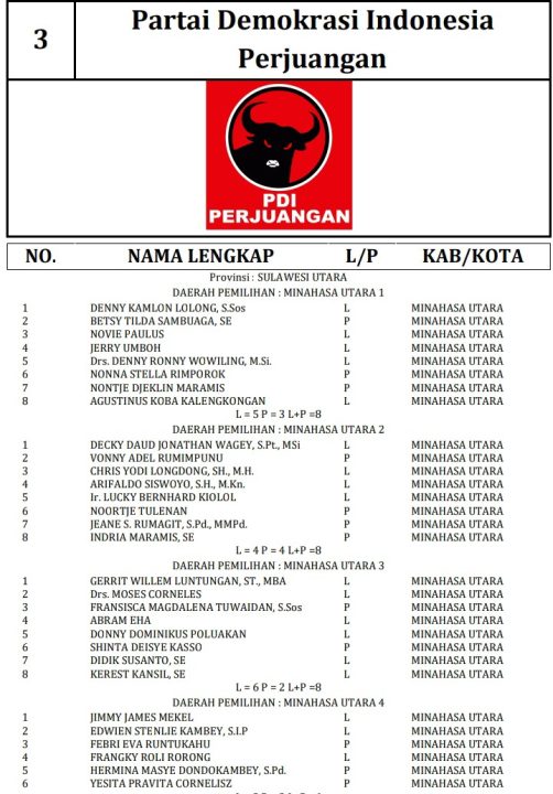 341 DCT tersebut terdiri dari 189 orang calon laki-laki dan 152 orang calon perempuan. Berikut daftar lengkap nama nama DCT anggota DPRD Minahasa Utara:
