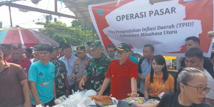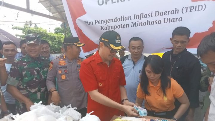 SULUT BASUARA.COM Minut – Bupati Kabupaten Minahasa Utara (Minut) Joune Ganda didampingi Kapolres Minut AKBP Dandung Wibowo bersama Tim Pengendalian Inflasi Daerah (TPID) gelar operasi pasar murah di Pasar Kauditan, Sabtu (15/12/2023)