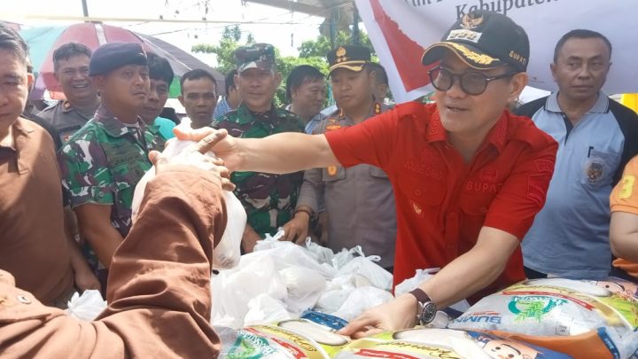 Dikesempatan itu, Bupati Joune Ganda mendadak jadi pedagang jual Bahan Pokok (Bahan Pokok) dengan harga murah dan disambut antusias warga.