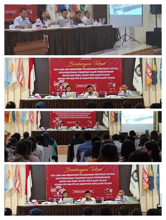 Komisi Pemilihan Umum (KPU) Kabupaten Kepulauan Talaud melaksanakan Bimbingan Teknis kepada PPK dan PPS terkait tata cara dan mekanisme pelaksanaan verifikasi faktual pasangan calon perseorangan Bupati dan Wakil Bupati Kepulauan Talaud. Kamis (20/6/2024).