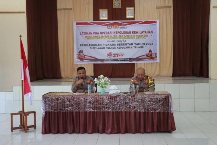 Sulutbasuara.com – Polres Kepulauan Talaud Polda Sulawesi Utara melaksanakan Latihan Pra Operasi (Latpraops) Kepolisian Mandiri Kewilayahan Mantap Praja Samrat 2024, di Aula Mapolres Talaud, kegiatan ini sendiri dilaksanakan dalam rangka pengamanan Pilkada Serentak tahun 2024 diwilayah Polres Kepulauan Talaud. Rabu (21/8/2024). Pagi