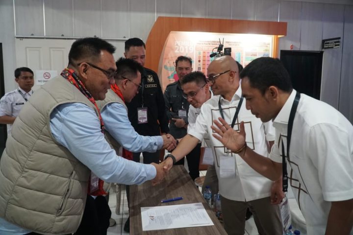 MJP- CK tak datangvsendiri, mereka didampingi parpol pendukung, setelah mengisi buku tamu, masuk ke ruang pendaftaran dan diterima jajaran KPU didampingi Bawaslu Minut.