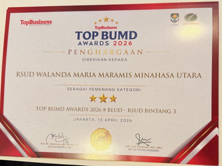 JAKARTA – RSUD Maria Walanda Maramis kembali menorehkan tinta emas di kancah nasional. Rumah sakit kebanggaan masyarakat Minahasa Utara ini sukses “menyapu bersih” tiga kategori penghargaan dalam ajang prestisius TOP BUMD Awards 2026 yang dihelat di Dian Ballroom, Hotel Raffles Jakarta, Senin (13/04/2026).