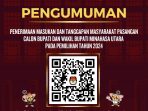 MINUT, SULUTBASUARA.COM – PENGUMUMAN NOMOR 24/PP.04.2-Pu/4/2024 TENTANG PENDAFTARAN CALON ANGGOTA KELOMPOK PENYELENGGARA PEMUNGUTAN SUARA UNTUK PILKADA TAHUN 2024 KOMISI PEMILIHAN UMUM KABUPATEN